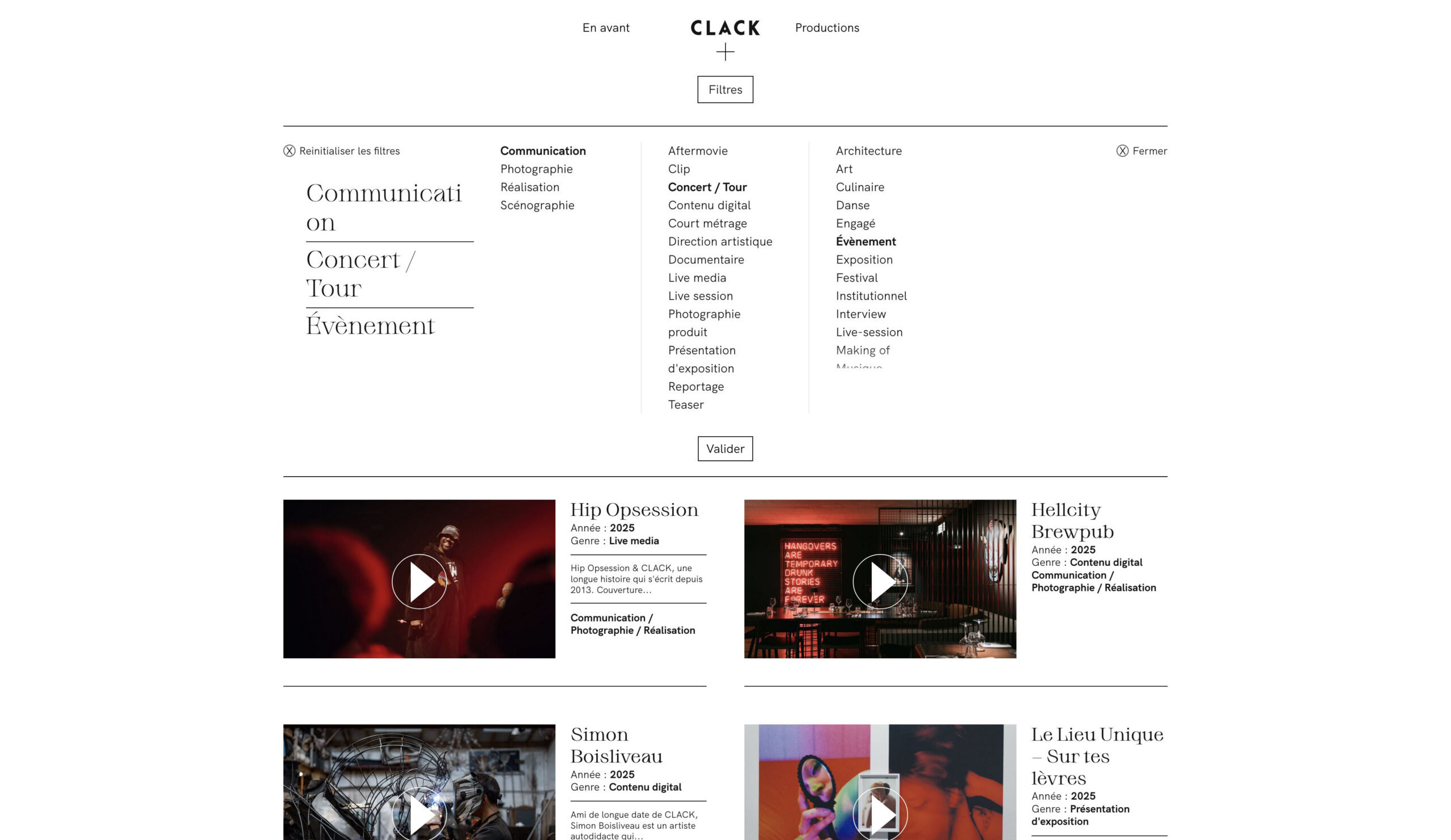 Pour faciliter l’exploration du vaste catalogue de productions de Clack – allant de la communication à la photographie, en passant par la réalisation, la scénographie et une multitude de formats (aftermovies, clips, documentaires, lives, etc.) – nous avons conçu un outil de filtrage sur mesure.