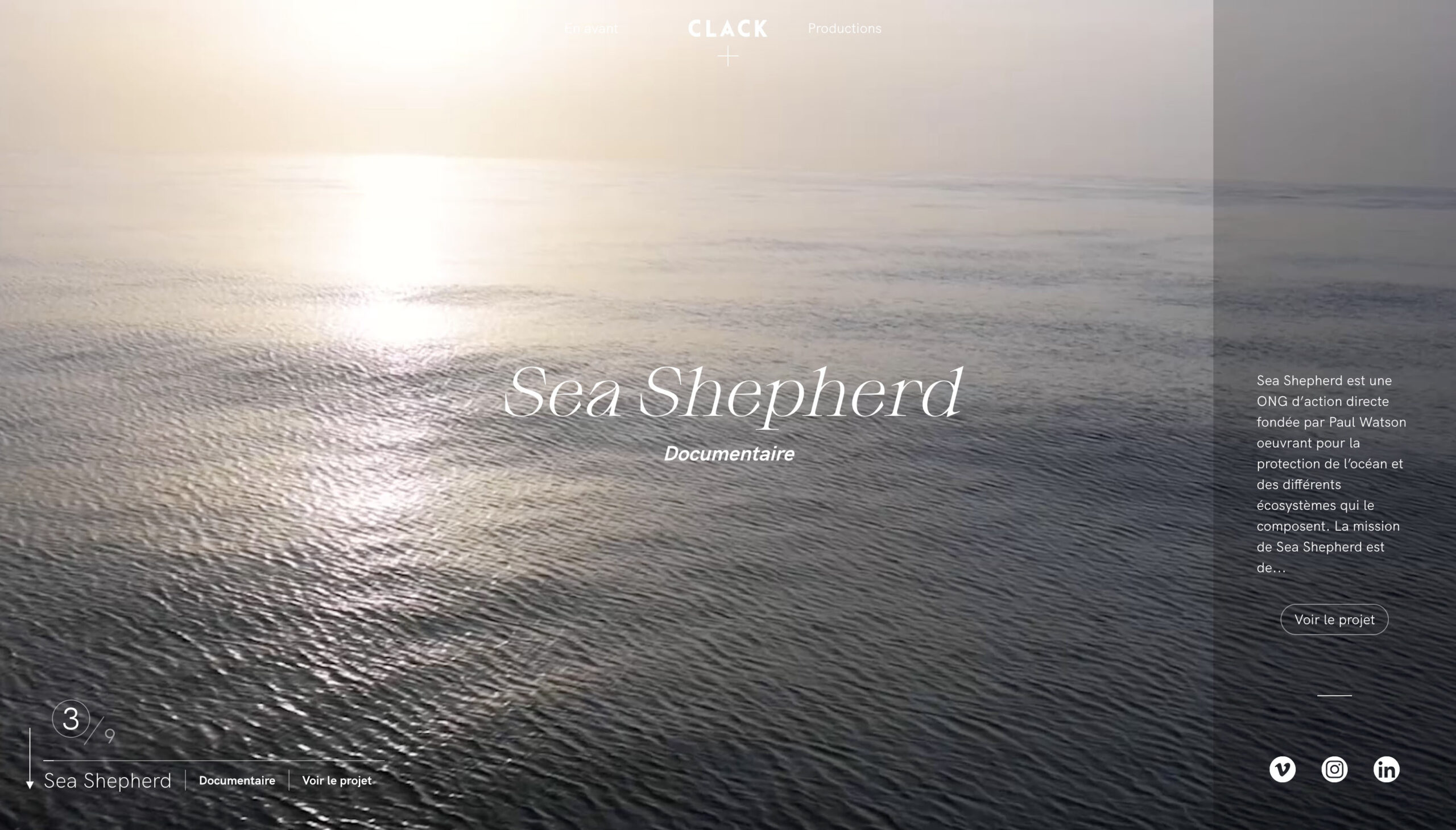 Pour le site de la société de production audiovisuelle Clack, nous avons repensé la page d’accueil en supprimant le scroll classique. À la place, un effet de glissade met en scène leurs vidéos : elles se figent d’abord, les images glissent élégamment, puis les séquences reprennent automatiquement. Cette approche capte l’attention et valorise chaque création dès l’arrivée sur le site.